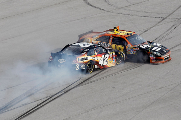 And this is how Kyle Busch's championship dreams ended Sunday at Talladega, with a hard hit by Juan Pablo Montoya (Photo: Getty Images for NASCAR)