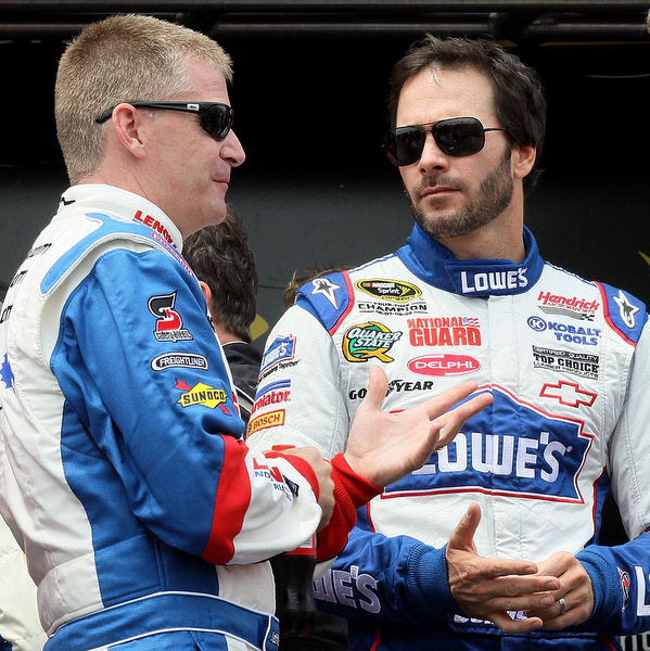 Jeff Burton (L) and Jimmie Johnson: When leader Burton didn't pit at the end of Sunday's Loudon 301, Johnson did, and those fresher tires made the difference (Photo: Getty Images for NASCAR)