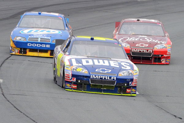 Jimmie Johnson in the final mile, leading Kurt Busch (outside) and Tony Stewart (Photo: Getty Images for NASCAR)