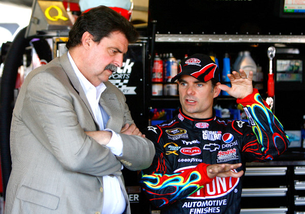 The big guy needs advice: NASCAR pres Mike Helton, here listening to Jeff Gordon (Photo: Getty Images for NASCAR)