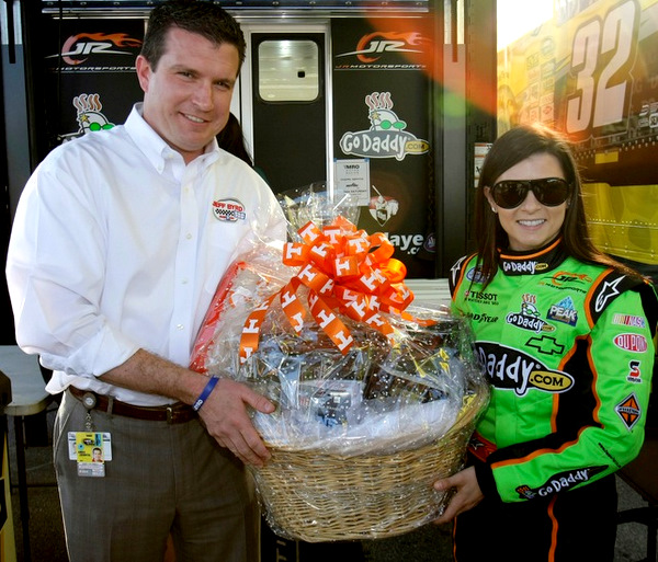 New Bristol boss Jerry Caldwell gives Danica Patrick a big basket of goodies. Patrick is having reason to smile when she arrives at NASCAR tracks this season, because she's running much better (Photo: Getty Images for NASCAR)