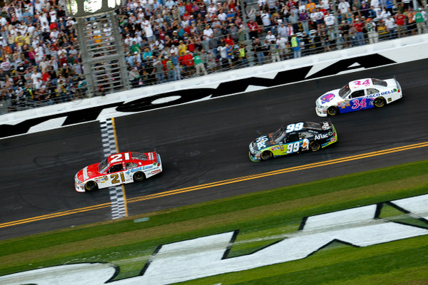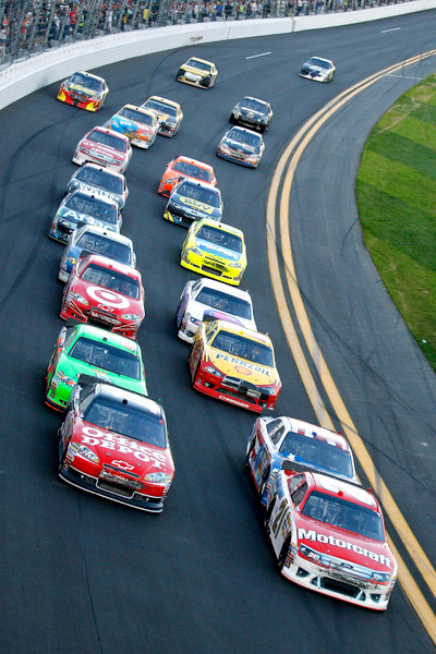 The key final restart: Trevor Bayne (21) on the inside, with Bobby Labonte pushing, then blocking; on the outside, Tony Stewart with pusher Mark Martin, and Kurt Busch (red and yellow) with David Gilliand on the inside. (Photo: Getty Images for NASCAR)