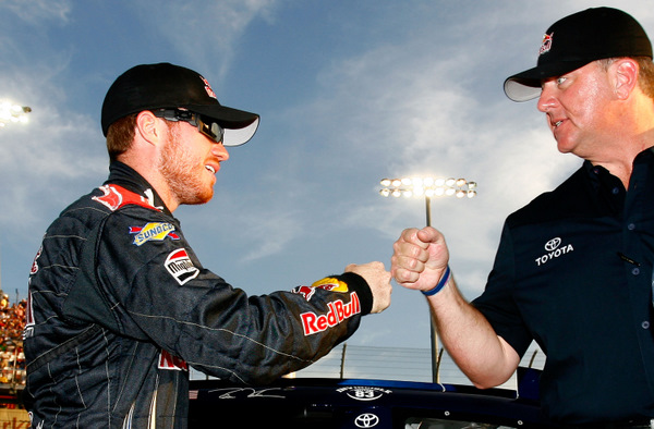 Brian Vickers (L) and general manager Jay Frye, in May at Darlington, just days before Vickers was hospitalized with mysterious blood clots (Photo: Getty Images for NASCAR)