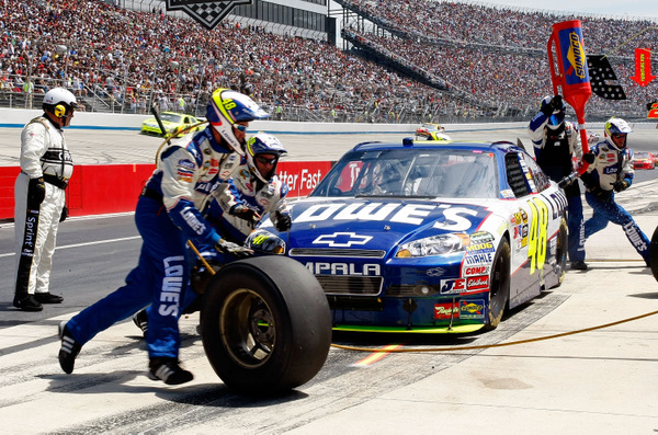There's more to a fast pit stop than just a fast pit crew....and Jimmie Johnson says that 'launch' out of the box late in Sunday's race was just soooo good that he got busted for speeding (Photo: Getty Images for NASCAR)
