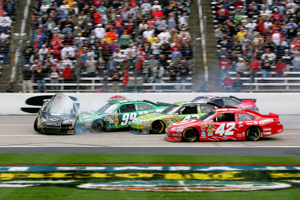 That's Jeff Gordon sideways, with Carl Edwards (99) in his door. Not a good way to finish....but Tony Stewart (red car outside) took the blame for this one (Photo: Getty Images for NASCAR)