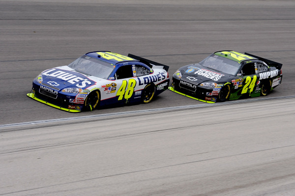 Jimmie Johnson (48) and Jeff Gordon (24) didn't play nice in Monday's Texas 500. Gordon had the car to win, and didn't. Johnson rallied to finish second (Photo: Getty Images for NASCAR)
