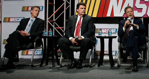 NASCAR's big guns, reviewing the state of the sport. Brian France (R), Mike Helton (C), and Steve Phelps (Photo: Getty Images for NASCAR)