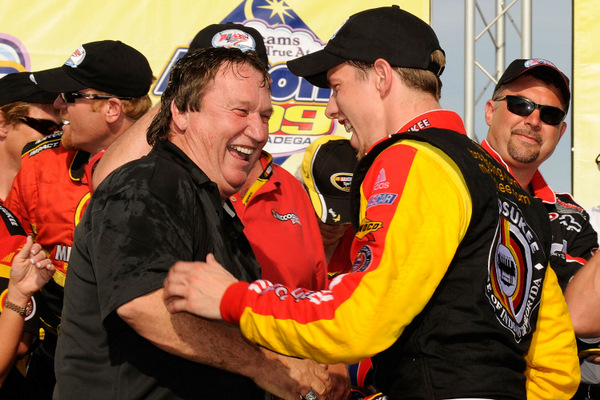 James Finch (L), here congratulating Brad Keselowsk in on that Talladega upset, is a fun-loving NASCAR team owner, and a 20-year stock car veteran (Photo: Getty Images for NASCAR)