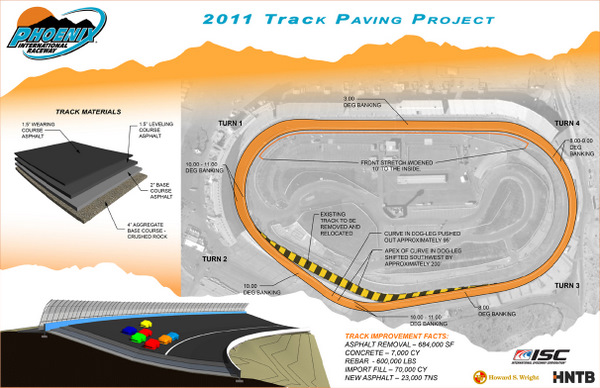Phoenix' new asphalt will be a similar polymer asphalt to that used at Daytona. After it's mixed, and before it's actually laid, Flugger will analyze it "for softening points, elongation…to see how that material can handle the heat and the stress. We've honed in a spec now that we'll be very happy with here; we've done a lot of tracks – Darlington, Daytona, Talladega, Homestead, Richmond, Martinsville….