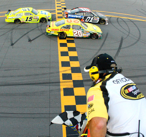 That Talladega setup...Tony Stewart (20) pinching Regan Smith below the yellow line after Smith began to make the pass on the last lap in 2008. Should Smith have simply held his ground, as Brad Keselowski did in the same situation later, and triggered a big crash? In retrospect, the way NASCAR handled the call, that's apparently what Smith should have done. (Photos: Getty Images for NASCAR)