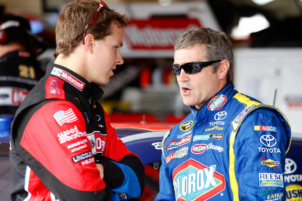 Trevor Bayne (L) listening to the man who helped him win the Daytona 500, Bobby Labonte (Photo: Getty Images for NASCAR)