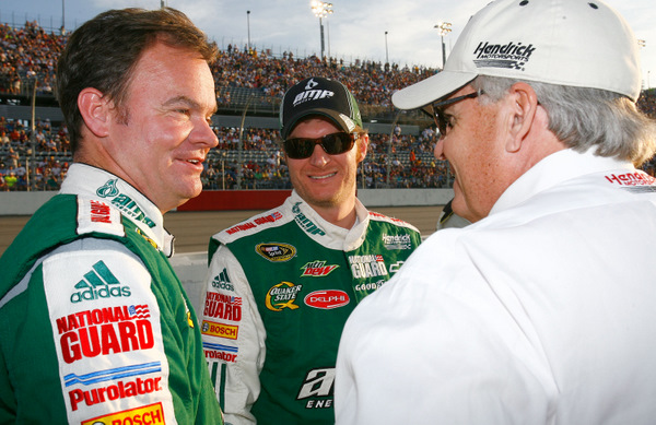 Crew chief Lance McGrew (L) and Dale Earnhardt Jr. (C) and car owner Rick Hendrick (R) are all smiles here....but they need some wins (Photo: Getty Images for NASCAR)