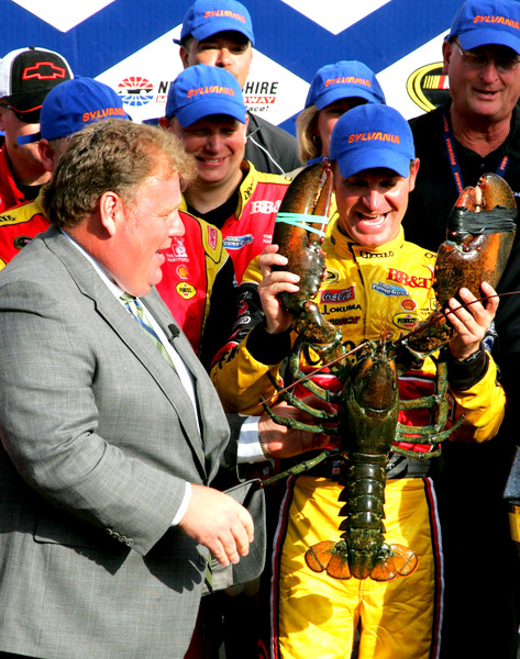 Clint Bowyer gets a victory lobster from Loudon track boss Jerry Gappens. (Photo: Getty Images for NASCAR)