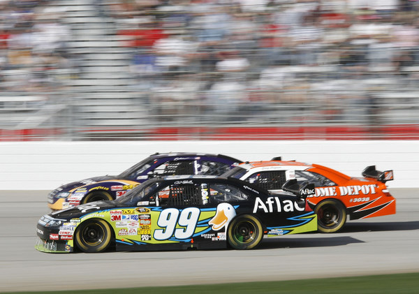 Sometimes Sunday the racing was good....but generally it wasn't as thrilling as this three-wide, with Carl Edwards on the inside of rookie Joey Logano (Photo: Getty Images for NASCAR)