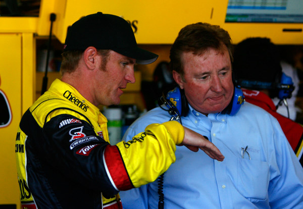Richard Childress (R) listens to Clint Bowyer (Photo: Getty Images for NASCAR)