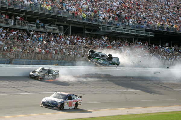 That ain't the way to victory lane. Carl Edwards flying over Ryan Newman's car (39) the last lap at Talladega, as Dale Earnhardt Jr. (88) narrowly escapes (Photo: Getty Images for NASCAR)