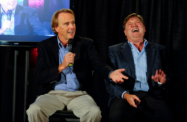 ESPN's Marty Reid, the new booth anchor in NASCAR coverage, must have a knack for good stories, because he's got NASCAR's Robin Pemberton in stitches here (Photo: Getty Images for NASCAR)