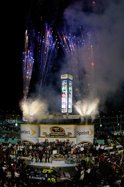 Fireworks and champagne for Jimmie Johnson and Chad Knaus...but only 83 days till the Daytona 500 (Photo: Getty Images for NASCAR)