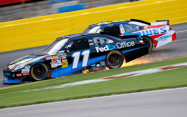 Denny Hamlin (11) took himself out of contention when he had to hit the dirt here in dodging a crashing Jimmie Johnson (Photo: Getty Images for NASCAR)