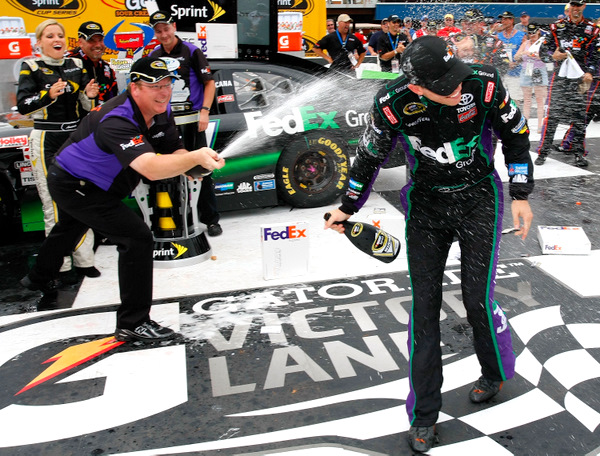 Crew chief Mike Ford sprays Denny Hamlin with more victory champaign (Photo: Getty Images for NASCAR)