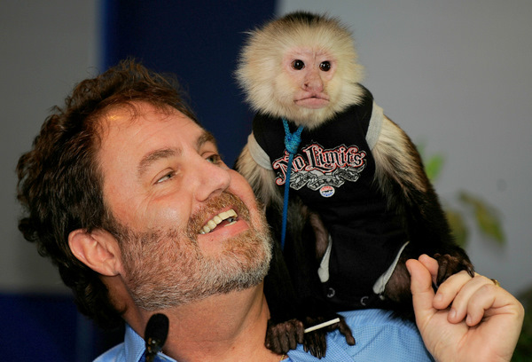 Texas' track promoter Eddie Gossage (L) is determined to prove even a monkey can sell race programs to his 'No Limits' Texas 500 (Photo: Getty Images for NASCAR)