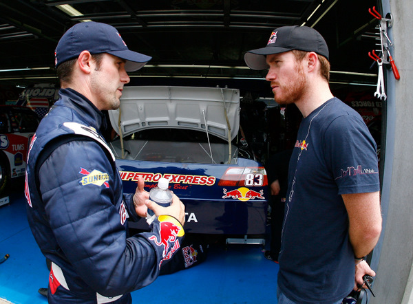 Brian Vickers (R) is sidelined while being treated for blood clots, andhe's getting a look at another side of this sport, doing some TV work and also feeding Casey Mears (L) as much information as he can about the new cars he's running, as Vickers' sub (Photo: Getty Images for NASCAR)