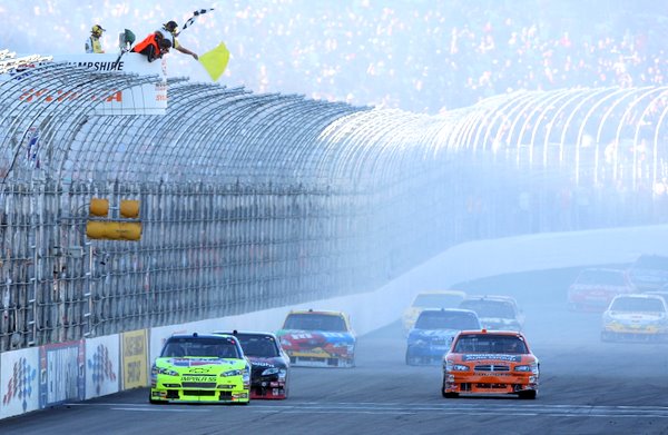 It was a smokey, controversial finish at Loudon Sunday, Mark Martin (yellow) winning, but with safety issues raised, like a slow yellow called for the race-ending yellow brought out by AJ Allmendinger's crash (orange car) (Photo: Getty Images for NASCAR)