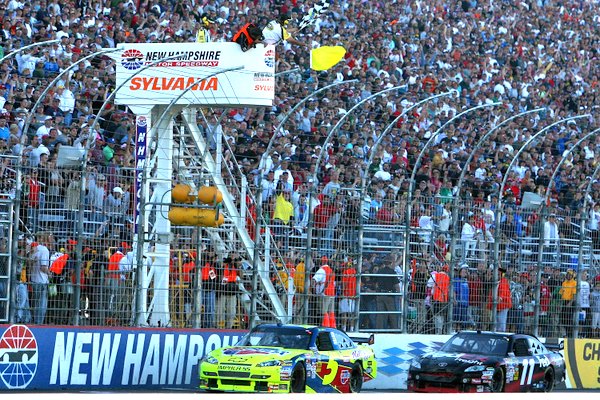 Yes, it was Mark Martin (5) winning at the finish line....but NASCAR used one of those 'hidden' scoring loops, buried in the asphalt, to set the final order, ruling Denny Hamlin (11) edged Juan Pablo Montoya for second (Photo: Getty Images for NASCAR)