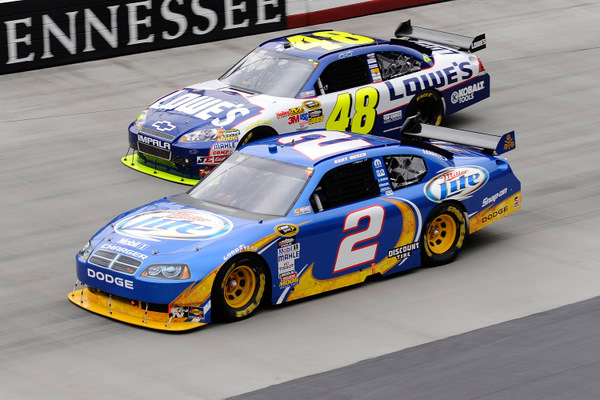Bristol's two best cars, in the last race with the old wing, Kurt Busch inside, Jimmie Johnson outside. And how will they fare this week at Martinsville with the new spoiler? (Photo: Getty Images for NASCAR)