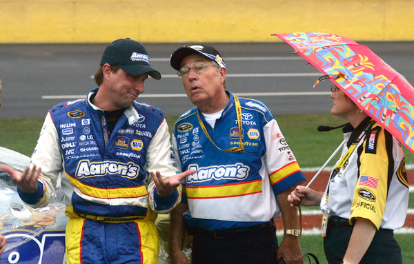 David Reutimann (L, here with his father Buzzie) gets lucky...and give crew chief Rodney Childers a tip of the hat (Photo: Getty Images for NASCAR)
