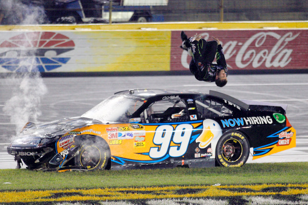 Carl Edwards' All-Star victory flip....but his car had to be towed to victory lane after he hit a low spot in the infield grass while celebrating. (Photo: Getty Images for NASCAR)