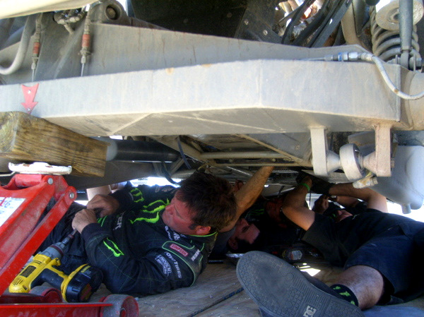Not a good sign: Robby Gordon, at mile marker 221 of the Baja 500, is under his Hummer repairing the transmission. Maybe all NASCAR drivers ought to have do their own repair work....(Photo: PlanetRobby)