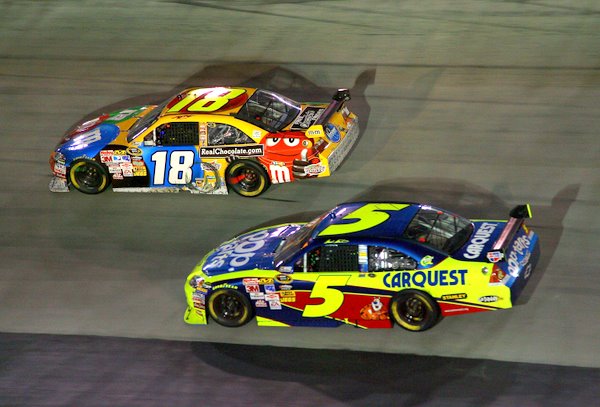 Kyle Busch (18) gave Mark Martin plenty of room to make the inside pass, but Martin couldn't quite pull it off (Photo: Getty Images for NASCAR)