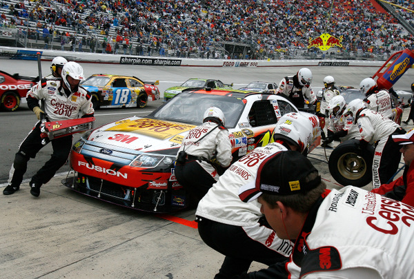 Biffle had been involved in a mid-race incident with Mark Martin that triggered a 13-car melee that took out strong contenders like Martin and Juan Pablo Montoya. Martin, with rain looming, made a bid to pass Biffle on the outside on lap 343, but Biffle shut the door, and Martin tagged the wall. As Martin was trying to limp back to pit road Marcos Ambrose plowed into Jeff Gordon, making quite a mess.