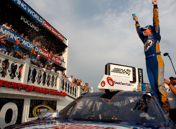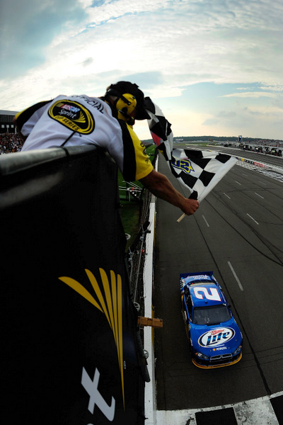 An Ironman performance by injured Brad Keselowski, beating Kyle Busch, Kurt Busch and Jimmie Johnson to win Sunday's Pennsylvania 500, and probably clinched a championship playoff spot with his second tour win of the season (Photo: Getty Images for NASCAR)
