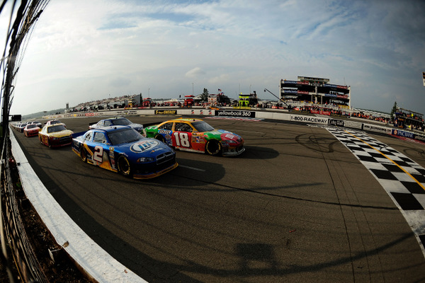 The crucial restart late: Kyle Busch on the inside with the lead, but Jimmie Johnson, right behind, didn't help, and Brad Keselowski (2) won the sprint to the first turn. And he took the clean air right to the bank. (Photo: Getty Images for NASCAR)