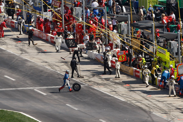 A crew member for Marcus Ambrose chases after a loose tire during the NASCAR Sprint Cup Series Kobalt Tools 500 at the Atlanta Motor Speedway. He was quickly suspended for the rest of the day for endangering his own life. (Photo by Chris Graythen/Getty Images)