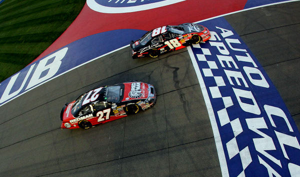 Kyle Busch (18) takes advantage of that Logano-Biffle tiff to win Nationwide 300, over Biffle (27)(Photo: Getty Images for NASCAR)