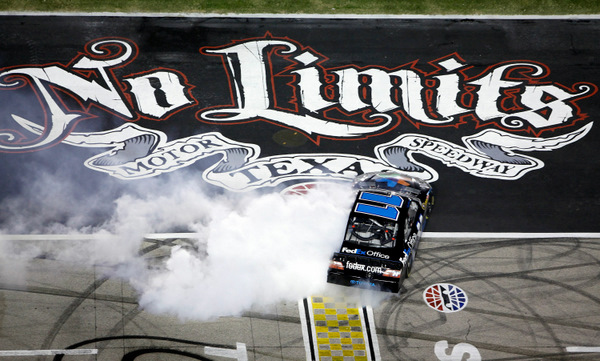 Denny Hamlin celebrates his eighth victory of the season, and his new status as Sprint Cup tour points leader (Photo: Getty Images for NASCAR)