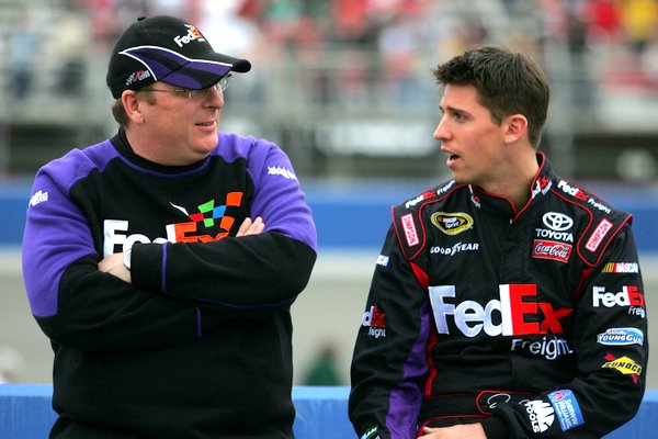 Hmmmm....wonder if crew chief Mike Ford (L) has found some chassis tricks for Denny Hamlin....maybe enough corner speed to take some of the wind out of Jimmie Johnson's sails in the title chase (Photo: Getty Images for NASCAR)