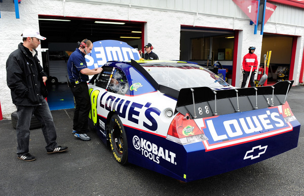 Crew chief Chad Knaus (L) studies Jimmie Johnson's Talladega Chevy, with that new rear spoiler, one of the March test versions (Photo: Getty Images for NASCAR)