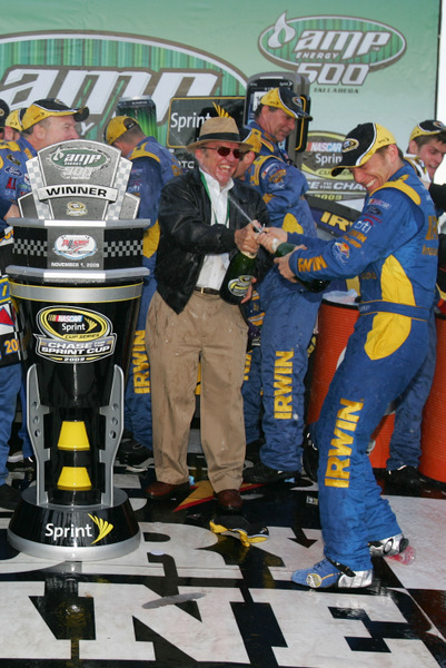 Jack Roush (L) celebrates the Talladega 500 victory with Jamie McMurray...but the veteran car owner may need to talk with NASCAR about more aerodynamic safety devices for these Cup cars, after Newman's flipping crash (Photo: Getty Images for NASCAR)