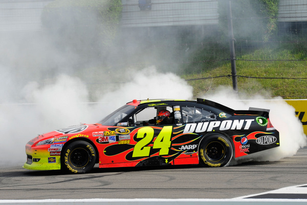 Jeff Gordon drops his window net and burns rubber in celebration (Photo: Getty Images for NASCAR)