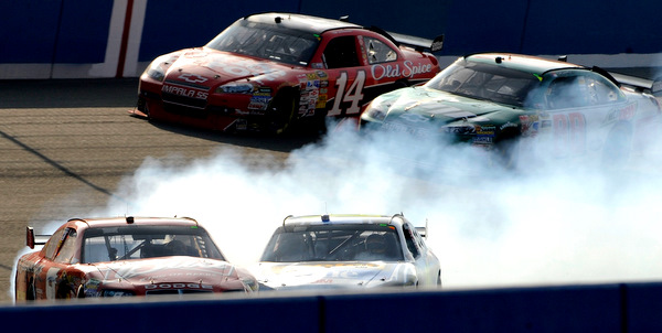 That's chasers Kasey Kahne (L, front) and Greg Biffle (R, front) nose-first into the wall...and all but out of the championship now....while Dale Earnhardt Jr. (88) is bracing himself for yet another frustrating ending to a day at the office. Tony Stewart (14) just barely escapes. (Photo: Getty Images for NASCAR)