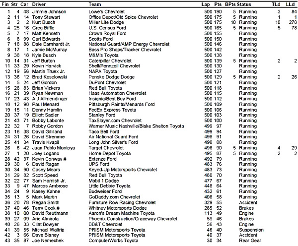 Busch dominated the 3-1/2 hour race, leading the most laps. But he and Johnson, who may have had the second-best car in the field, both took four tires on the final round of pit stops, with 14 laps to go. And four others – Greg Biffle, Matt Kenseth, Carl Edwards, and Stewart – gambled on just two tires.