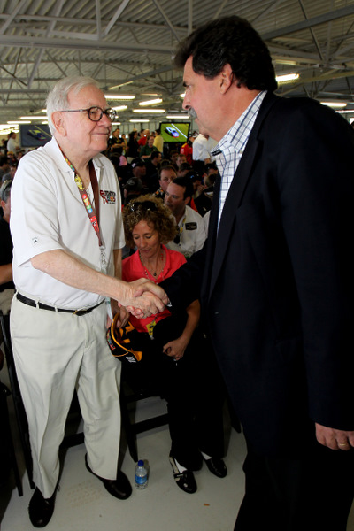 Even Warren Buffett, here getting a handshake from NASCAR president Mike Helton, was on hand for the Kansas 400. It was an invite from his friends at Mars. (Photo: Getty Images for NASCAR)