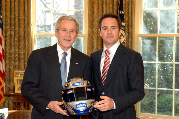 Jimmie Johnson, here with former President George Bush, is no stranger to the White House. But Monday's invite to meet with new President Barack Obama -- is that a move by the Obama administration to reach out to the NASCAR audience? Is an invite to Obama to a NASCAR race next on the agenda? (Photo: Getty Images for NASCAR)
