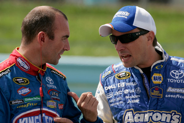 Uh, Denny Hamlin, looks here like David Reutimann (R, here talking with teammate and fellow Pocono victim Marcos Ambrose) is still pretty animated....about that little bump-and-run at Pocono? (Photo: Getty Images for NASCAR)