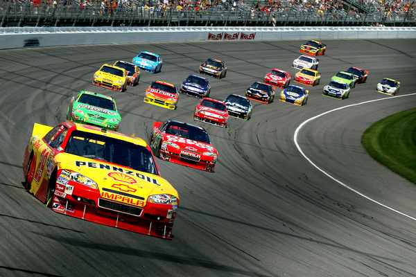 Kevin Harvick leading a four-wide pack. Now this is the kind of racing Michigan used to be renowned for....and it's the kind of racing that California Speedway should have too -- if California Speedway had the right banking, like Michigan's 18 degrees, instead of it's too-flat 14 degrees. (Photo: Getty Images for NASCAR)