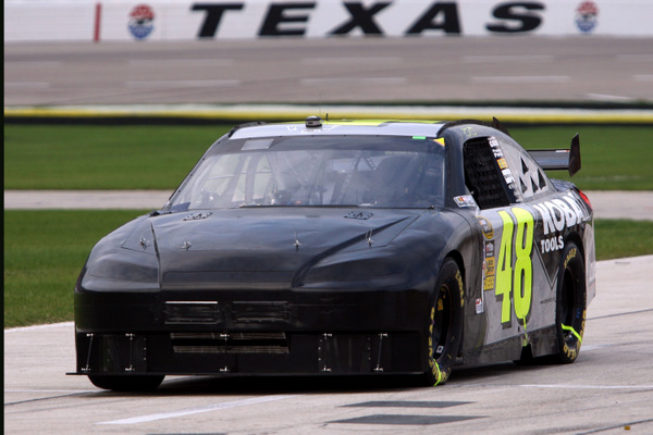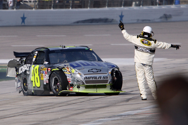 After the crash on lap three of the Texas 500, NASCAR tour leader Jimmie Johnson heads to the garage for repairs. (Photo: Getty Images for NASCAR)
